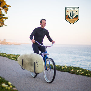 We recommend hooking the adjustable side of the hook into the eyelet of the surf rack bars, pulling the cord over the top rail of your board, and then taking it over to the bike frame. Wrap it around a few times and hook it to itself or a part of the frame to secure it. Take care not to restrict any brake or shift cables with the bungee cords. This approach will pull the top rail of the board toward the center of the bike, which greatly improves stability while riding. Wrapping the cord around the bike a few times provides an alternate way to adjust tension in the cords vs using the adjustable buckles.
